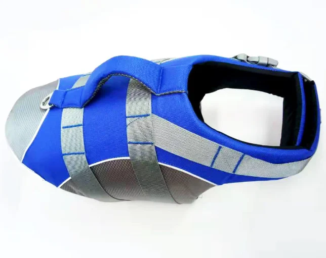 The dog flotation vest is a blue buoyancy aid made with high-density foam core, reflective stripes, reinforced handle, and multi-point quick-adjust buckles from polyester fabric, available in six sizes from XS to 2XL for dogs weighing 2.5-55 kg to support water safety and comfort for bulk procurement and distribution.
