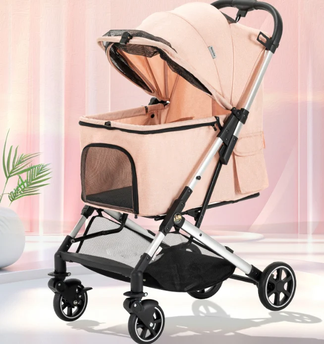 The dog stroller features a metal frame with aluminum alloy lightweight construction, ventilated mesh adjustable canopy, bottom storage basket, four smooth durable wheels, unfolded dimensions of 28 inches long by 19 inches wide by 41 inches high, and 55lbs weight capacity, suitable for small to medium dogs.