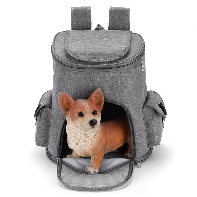 The dog backpack for dogs is a gray polyester carrier with high breathable mesh windows, multi-functional storage pockets and adjustable shoulder straps designed for convenient travel with small to medium dogs and cats and supplied for B2B wholesale procurement.