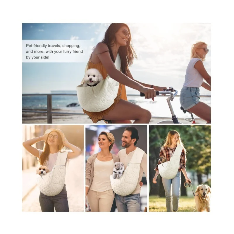 The dog sling carrier is a shoulder style pet carrying bag made of high quality polyester quilted fabric available in black and camel colors with multiple pockets and an adjustable shoulder strap suitable for small dogs weighing 7 to 13 pounds.