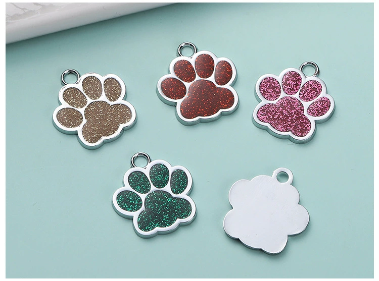 Zinc alloy custom dog tags in paw print shape with front sequin decorations, silver metal edging and hanger, blank back for engraving, size 2.5x2.7cm, available in multiple colors for pet identification.
