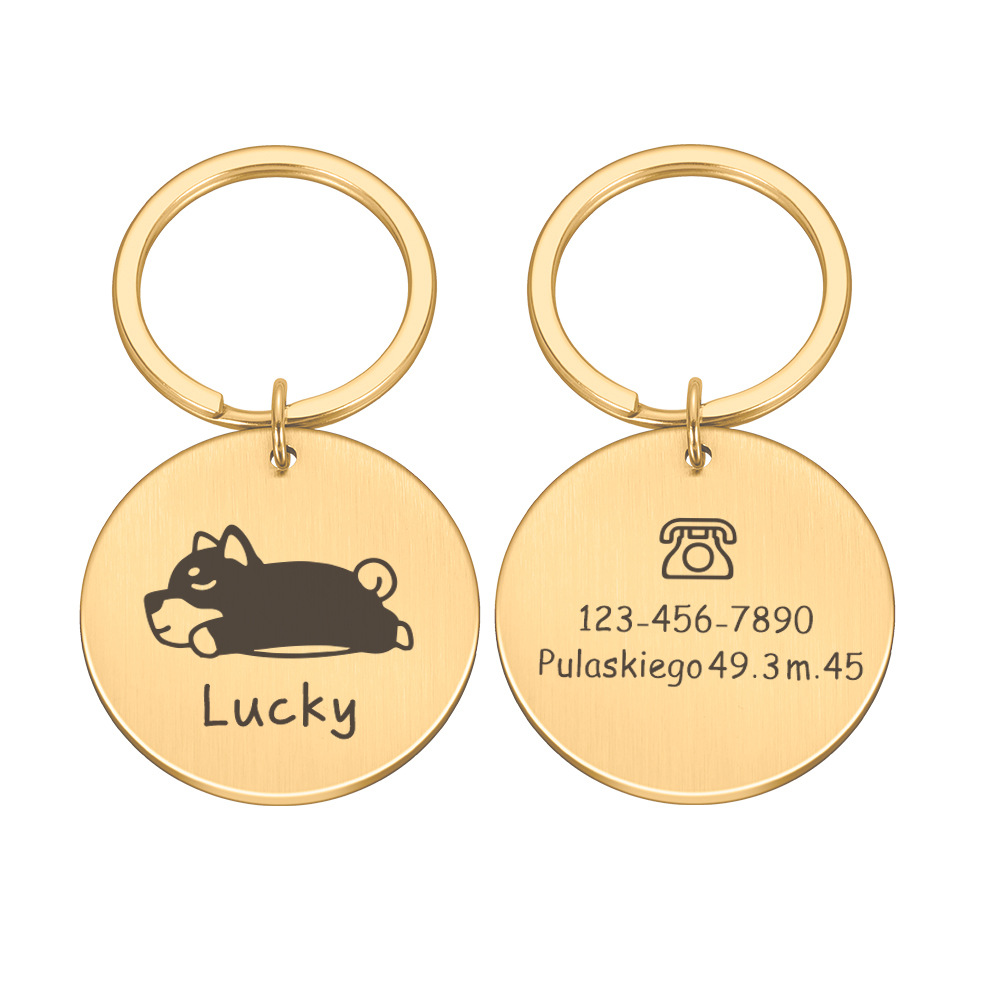 This stainless steel dog tag features a round brushed-metal design measuring 35×35mm with a secure split key ring and laser-engraved custom graphics, available in silver, rose gold, gold, and black finishes for durable, rust-resistant pet identification.