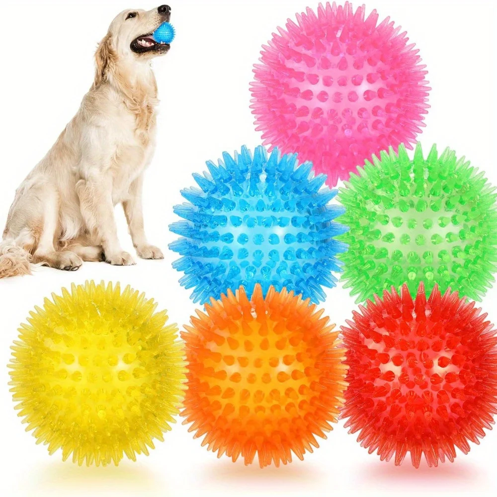 A high-quality multi-color elastic sounding spiked ball dog toy that features teeth cleaning, bouncing interactive and throwing training functions, suitable for pet supplies wholesalers for bulk purchase, measuring 2.56 inches in diameter and made of durable semi-transparent plastic.