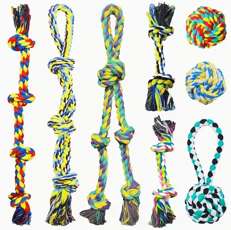 The rope ball dog toy is a 9-piece set of multi-color cotton braided items consisting of 2 double strand three knot ropes at 60cm, 2 five knot ropes at 72cm and 62cm, 2 large two knot ropes at 33cm, 2 colored cotton balls at 7cm and 1 blue single ear ball at 21cm, all made from cotton rope for interactive dog play suitable for bulk procurement.