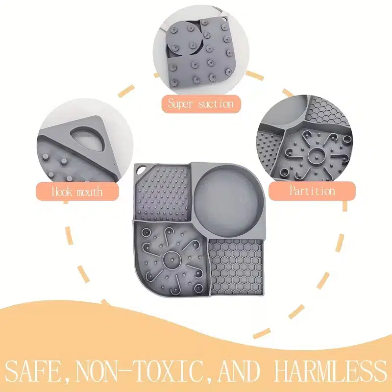 This customizable silicone lick mat features four textured zones to promote slower eating and reduce pet anxiety, perfect for home or kennel use. Ideal for OEM manufacturing and bulk wholesale orders from our factory.