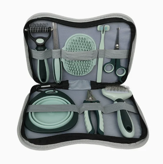 This dog brushes and combs set comprises multiple specialized grooming tools with plastic handles, metal teeth, and a portable carrying case, designed for coat maintenance including undercoat removal, detangling, and nail care across various dog breeds.