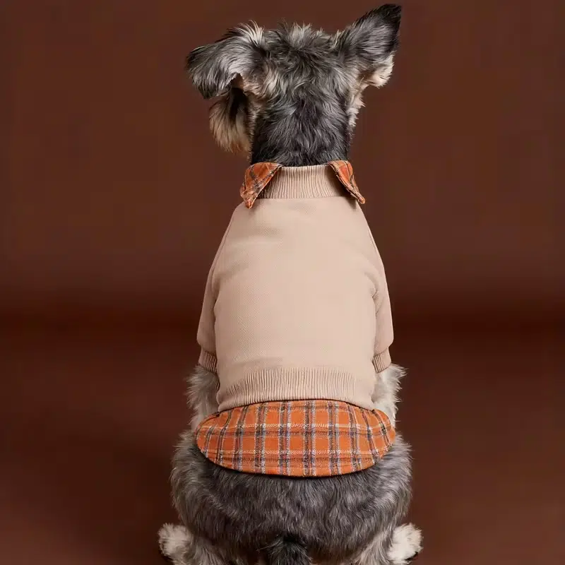 Fleece dog sweatshirt with plaid detailing for fall and winter lines. Ideal for buyers seeking factory-backed custom colors and bulk-ready production options.