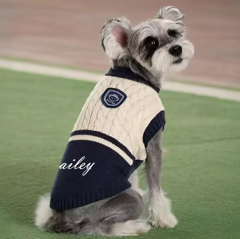 Warm cable-knit dog sweater with name embroidery, ideal for winter retail bundles. SUN PET supports full OEM sizing, colors, and logo programs for bulk buyers.