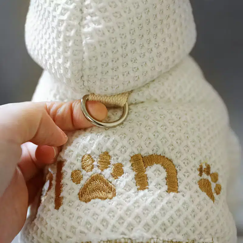 Warm waffle-knit hoodie with a soft plush lining and a clean D-ring setup for daily walks. Ideal for wholesale buyers needing custom OEM pet apparel.