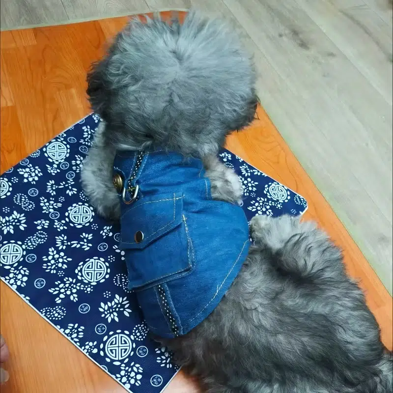 Back vest-style dog garment made from deep blue denim fabric, featuring flap pockets, decorative buttons, and a D-ring for leash attachment, suitable for daily wear and dog walking.