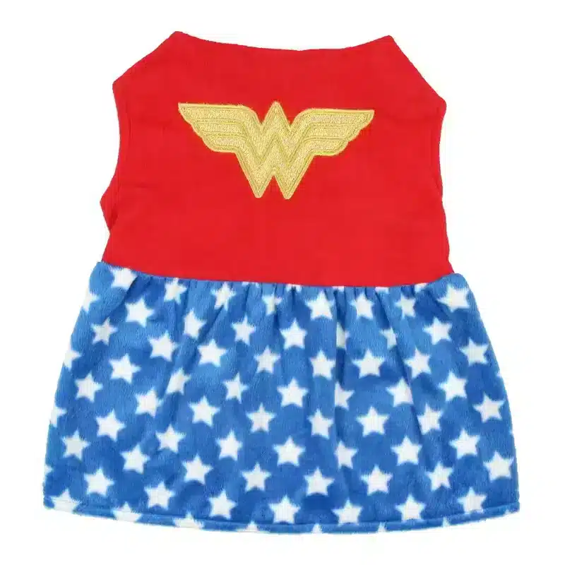 Bulk OEM Wonder Woman superhero pet costume in red/blue for dogs/cats. Ideal for Halloween wholesale, factory customization, B2B branding.