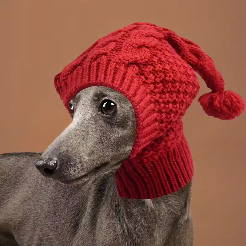 Supply customizable knitted dog hats to pet retailers for winter collections. Factory OEM options suit small-medium breeds like Greyhounds, with scenes in holiday displays or cold-weather outings.