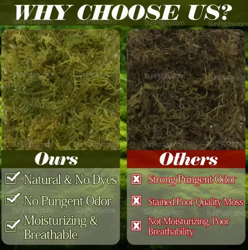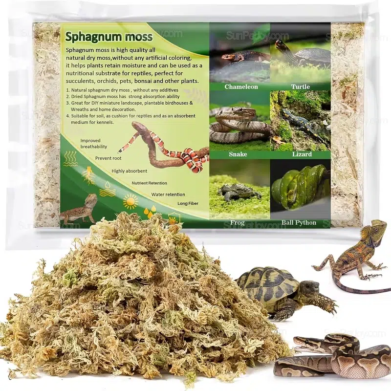 Natural sphagnum moss bedding for snake terrariums, designed for humidity control, nesting, and hides. Factory supply with flexible size, packing, and material customization.