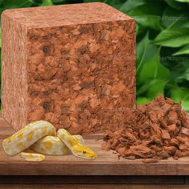 Compressed coco fiber chips designed for snakes enclosures, supporting stable moisture levels. Suitable for bulk supply, private label, and factory customization.