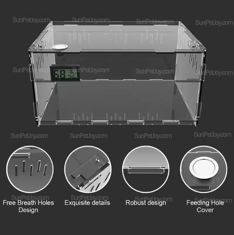 Designed for snake breeding, quarantine, and transport, this portable acrylic box supports custom sizes, panel layouts, and branding for factory and bulk buyers.