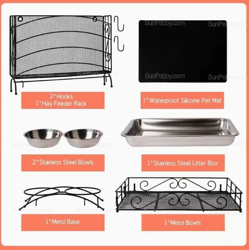OEM small animals feeding and hygiene system combining hay feeder, litter tray and bowl stand. Designed for wholesale programs and custom cage solutions.