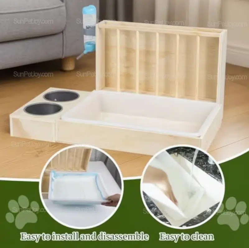 Small Animals hay feeder and litter box system designed for wholesale and OEM supply, featuring a wooden hay rack, bowls, and water feeder with custom options.
