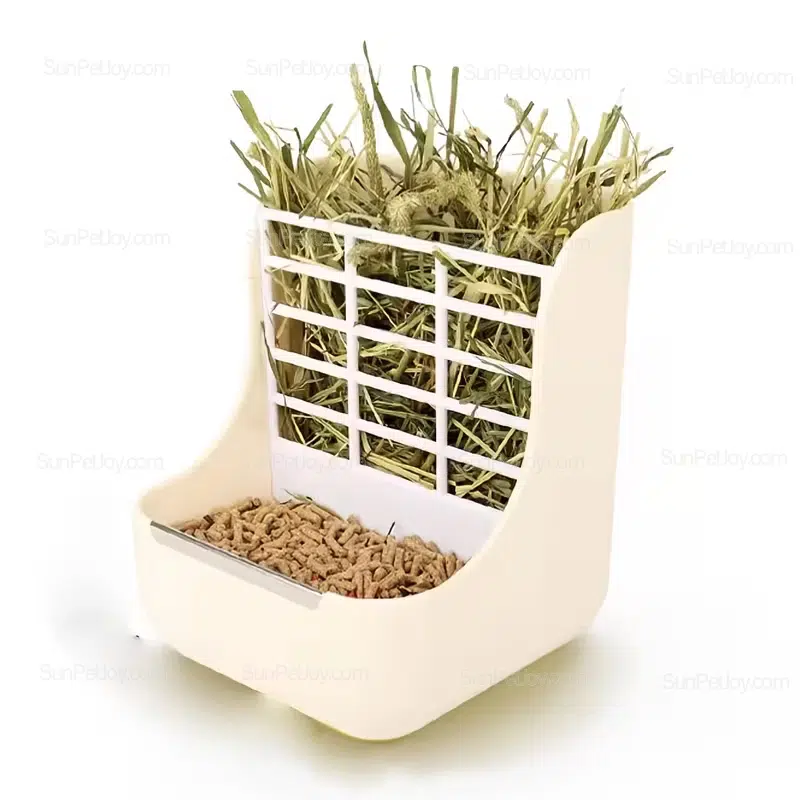 Dual-function hay feeder for Small Animals with slow feeding rack and pellet tray. Designed for cage use, bulk supply, and OEM feeding solutions.