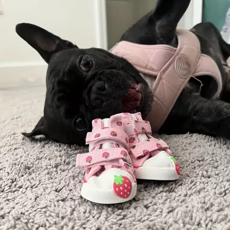 Lightweight dog booties with soft mesh, anti slip soles and cute strawberry details. Easy hook and loop straps ensure a secure fit. Ideal for bulk OEM buyers needing custom colors and branding.