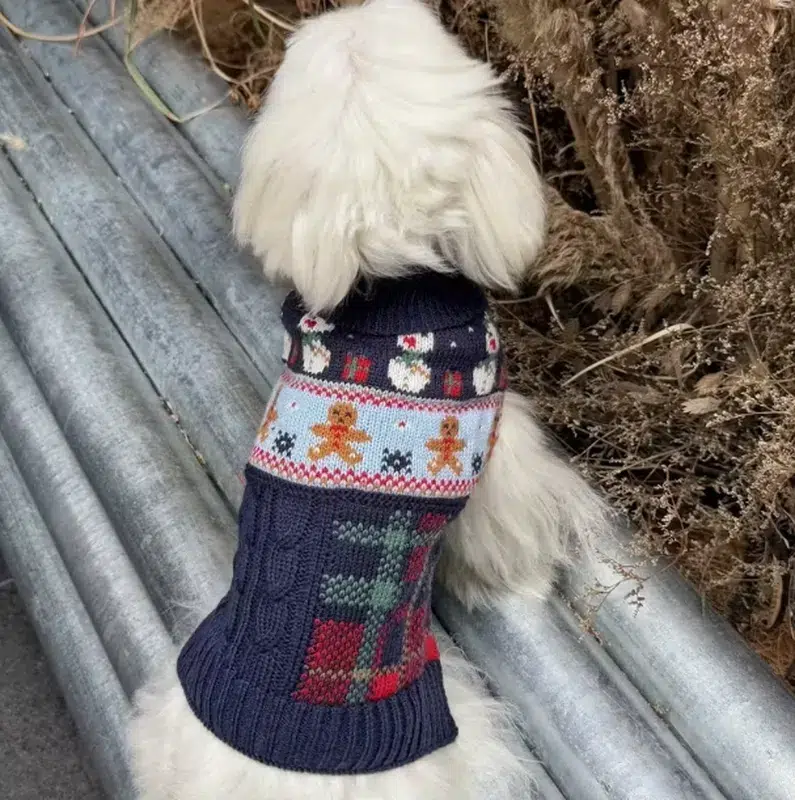 Cozy 100% acrylic pullovers with gingerbread & snowman motifs in green/navy. Ideal for B2B factories: OEM custom wholesale dog clothing for mini breeds in winter scenes. Machine washable.