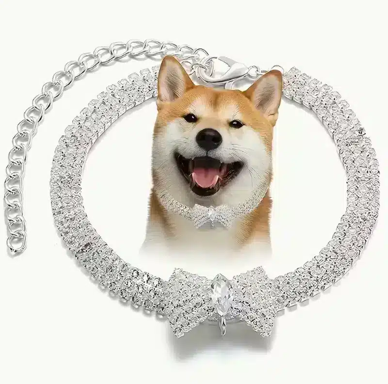 Sparkling crystal bow dog necklace for weddings/parties. OEM/custom wholesale for B2B factories; adjustable, durable for small-medium pets.