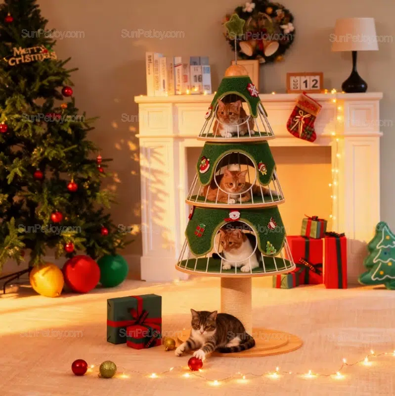 Wholesale Christmas tree cat tower designed for multi-cat use, ideal for retail and brand projects. Factory-made with custom size, color, and materials.