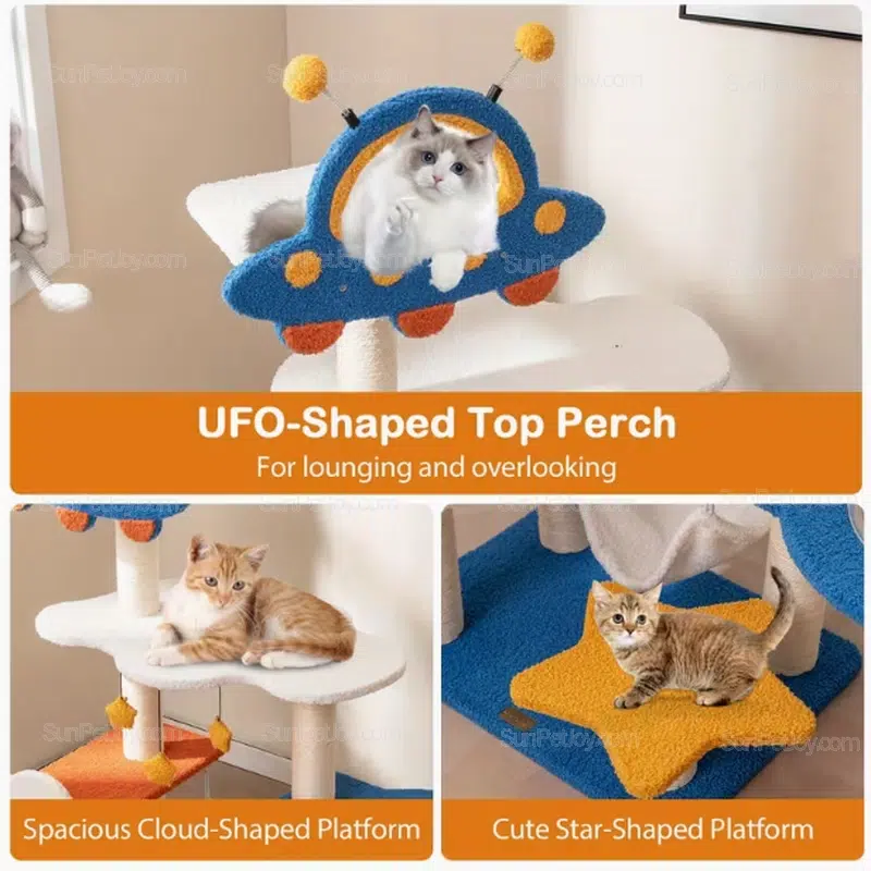 OEM space-themed cat tree designed for brands and retailers, featuring a UFO perch and modular platforms with support for size, color, and material customization.