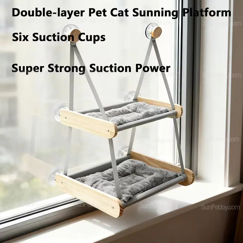 Wholesale wooden cat hammock with strong suction cup mount. Ideal for window sunbathing. Perfect for B2B factories seeking OEM/ custom production.