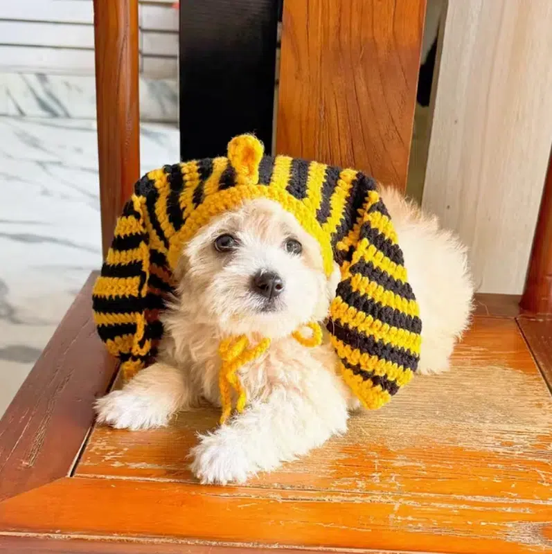 Wholesale crochet Egyptian Pharaoh pet hat & bib combo in black-yellow stripes. Soft acrylic yarn, adjustable ties, blue gem accent. Ready for bulk OEM runs, private label, or custom colorways for pet brands and Halloween distributors.