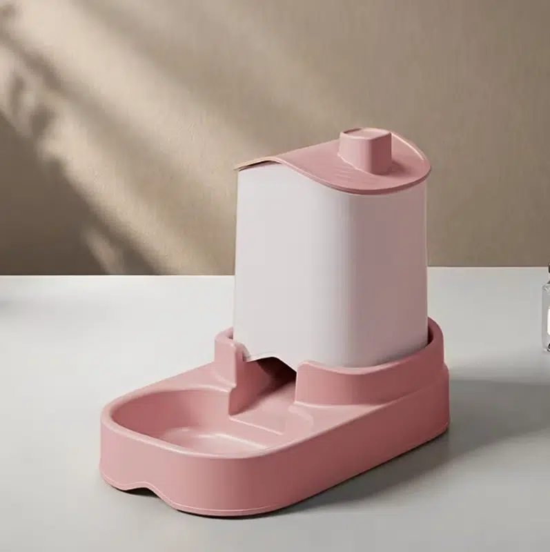 Modern gravity pet feeder with integrated water bowl, ideal for retail programs and bulk sourcing. Factory-direct production supports custom colors and private label needs.